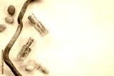Arabian oud attar oil - perfume in glass bottles. Overhead view