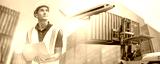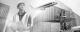Smiling Portrait of man engineer in yellow hard hat, working on laptop Computer. Inspector or Safety Supervisor in Container Terminal, shipping transportation worker work at shipping