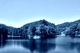 big lake in the middle of forest with blue sky and pines on presa del llano village of carbon