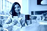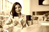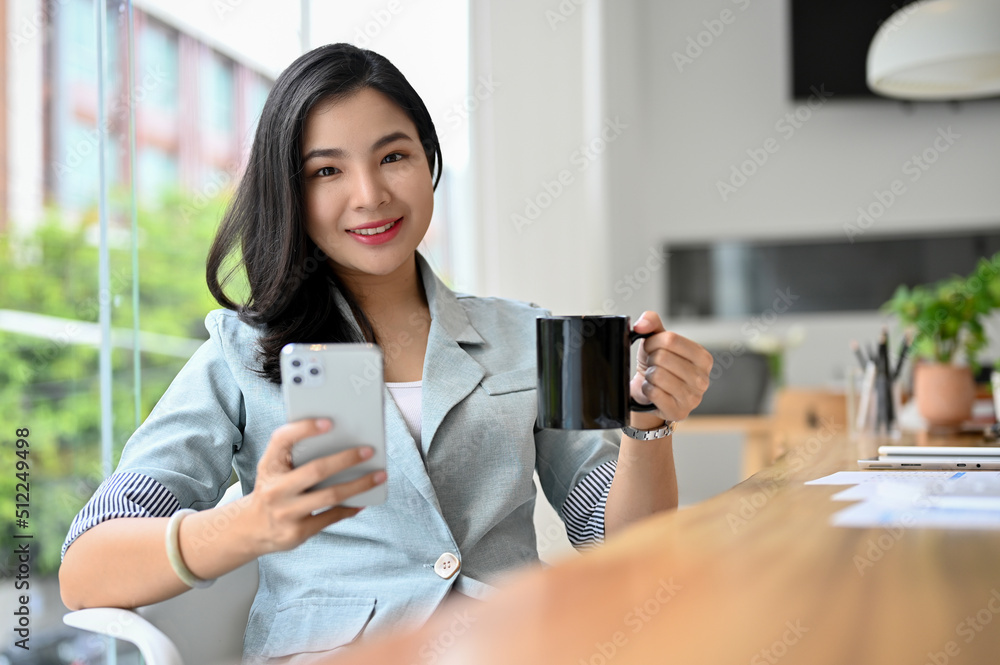 Charming young asian businesswoman sipping coffee while using a smartphone