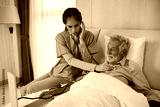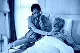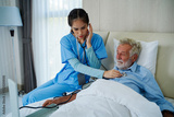 a nurse with a stethoscope listens to an elderly patient Check the heart, check the old people, retire at home. Elderly heart disease, heart disease concept