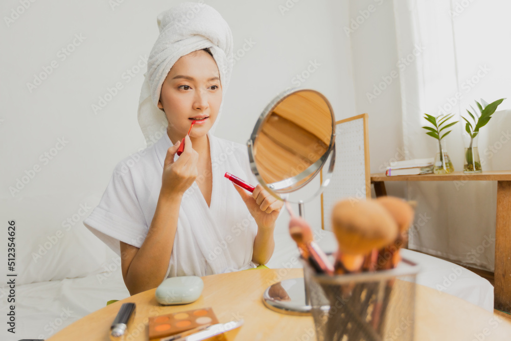 Beautiful Asian woman applying red lipstick to make up her face at home