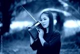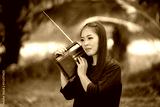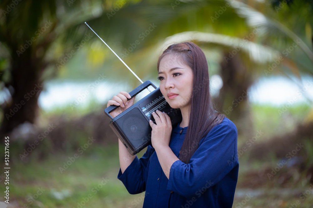 Portrait beautiful happiness asian farmer wearing blue Mauhom shirt and hat under listen music for vintage radio relaxed between work with green nature background.