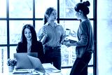 Asian creative team sitting and working sharing creative ideas inspire in workshop together.