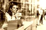 Young business woman drinking coffee in a cafe in the city