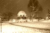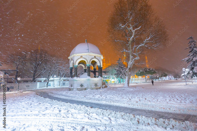 The beautiful landscape with German Fountain in old Hippodrome, Istanbul, Turkey one winter day with many snow. Snow storm in Istanbul.