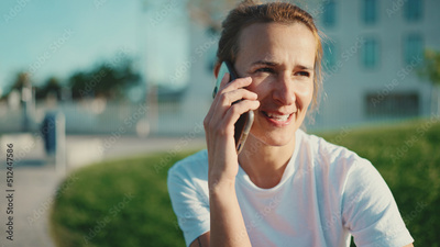Portrait of blond woman looking happy talking over smartphone while waiting beginning of workout in city park