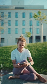 Attractive woman dressed in sportswear checking smartphone outdoors. Young yogi woman resting with mobile phone
