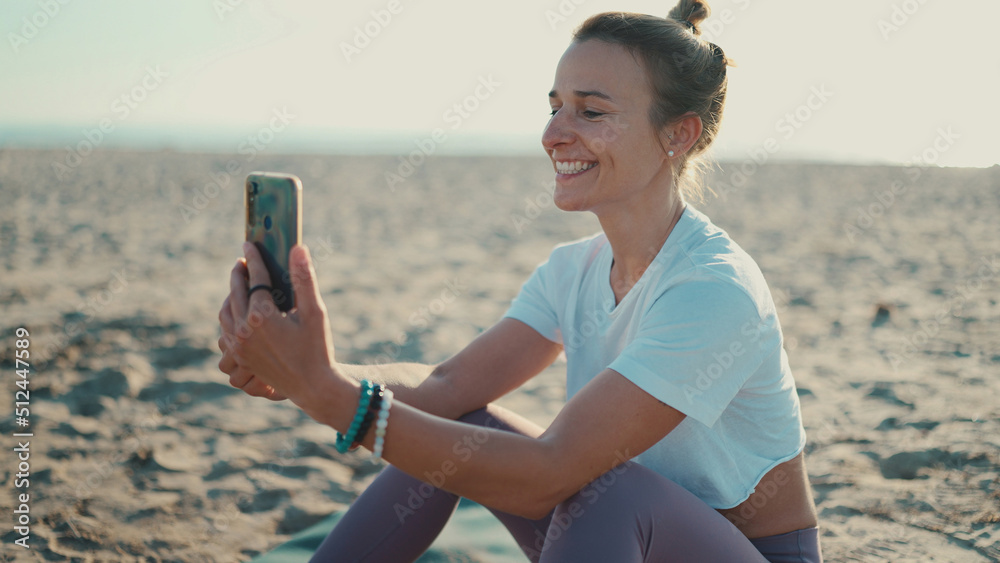 Beautiful sporty woman talking on video chat over smartphone resting after yoga on the beach. Young woman using mobile phone for distant communication