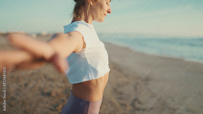 Beautiful woman with slim body enjoying morning yoga practice on the beach. Sporty girl looking fresh standing by sea