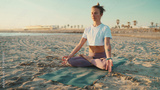 Beautiful blond woman dressed in sportswear sitting in lotus pose by the sea. Yogi girl meditating on mat on beach