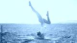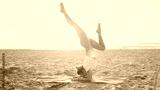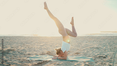 Beautiful stylish woman doing yoga pose handstand with splits on the empty beach. Young stunning yoga teacher practicing yoga on mat