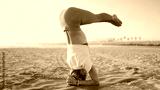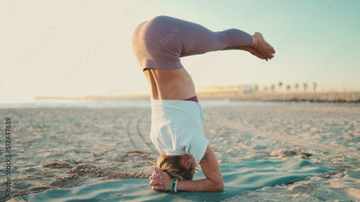 Beautiful strong yogi girl doing headstand while practicing yoga poses by the sea. Pretty woman keeping balance during practice morning yoga on beach