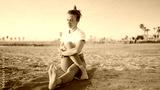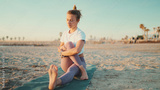Professional yoga teacher stretching during morning yoga practice on the beach. Yogi girl in leggings doing yoga