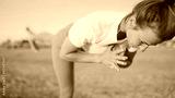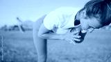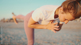 Close up sporty girl keeping balance during yoga practice by the sea. Beautiful woman in sportswear on workout