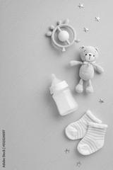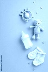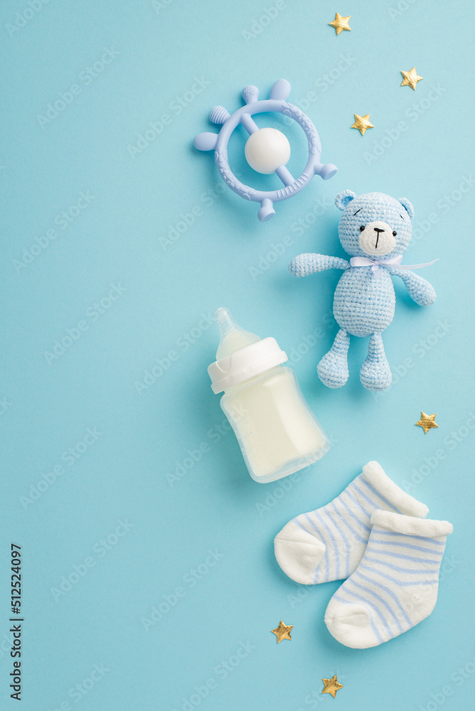 Baby accessories concept. Top view vertical photo of socks teether milk bottle knitted teddy-bear toy and gold stars on isolated pastel blue background