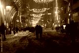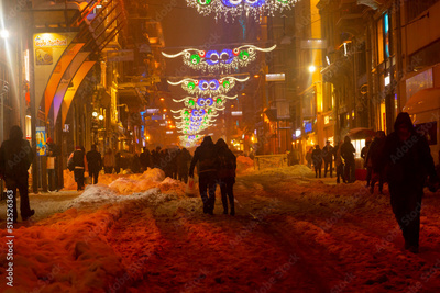 Snowy day in Taksim, Beyoglu. Nostalgic tram in Istiklal Street. Taksim Istiklal Street is a popular destination in Istanbul, Turkey.