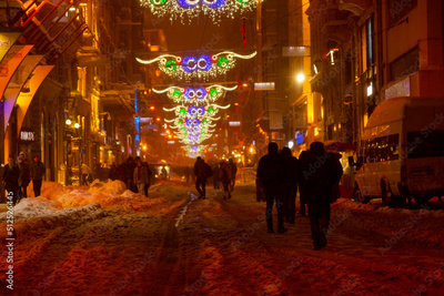 Snowy day in Taksim, Beyoglu. Nostalgic tram in Istiklal Street. Taksim Istiklal Street is a popular destination in Istanbul, Turkey.