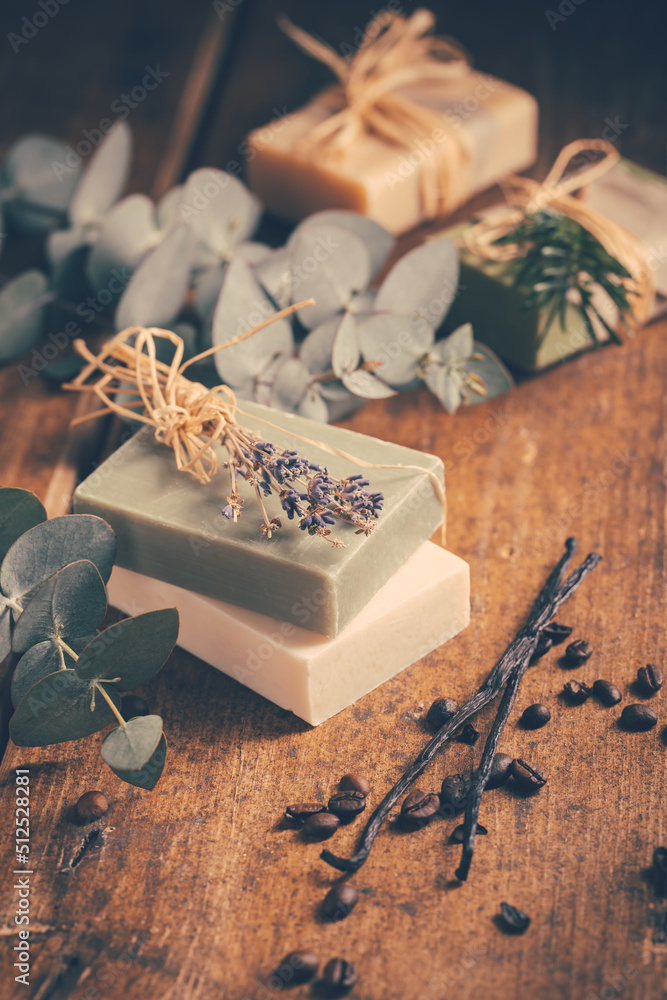 Natural organic soap bars with vanilla, coffee beans and eucalyptus