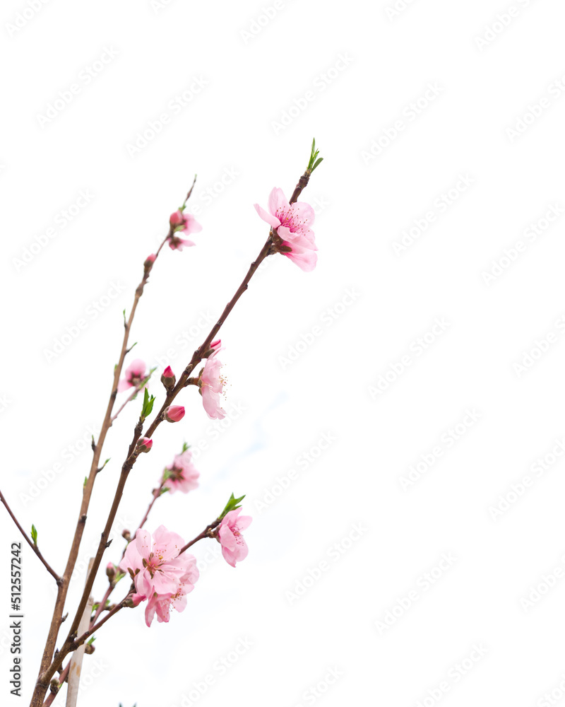 Homegrown blooming peach flowers at house front yard isolated on white background in North Texas, America