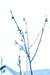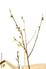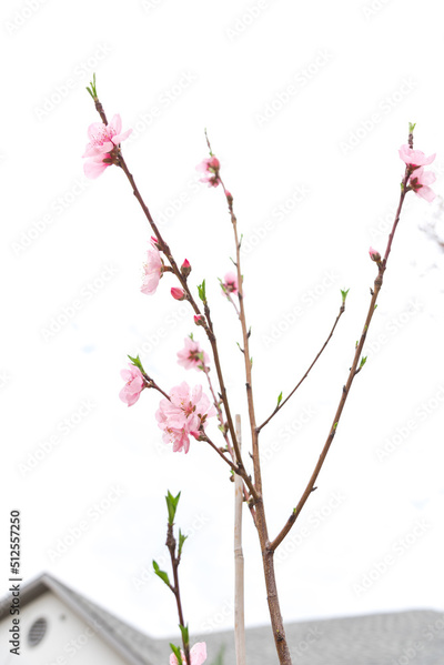 Homegrown blooming peach flowers at house front yard isolated on white background in North Texas, America