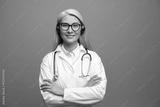 Middle-aged Asian woman doctor in white medical gown with stethoscope using wireless headset for call to patient, looking at camera standing isolated on brown. Consulting and therapy online