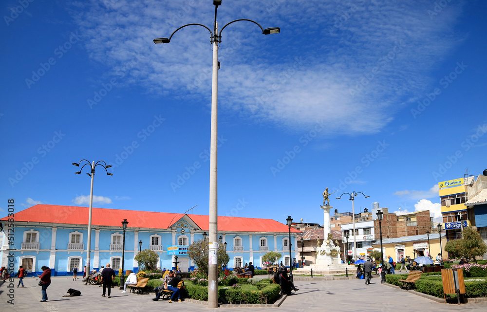 Street Scene of Plaza Pino Square with the Monument to Dr Manuel Pino and War of the Pacific's Victims, City of Puno, Peru, South America