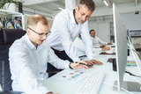Employees of the company interact in the process of work and help each other in solving problems by discussing current goals. People in the office and at their workplaces