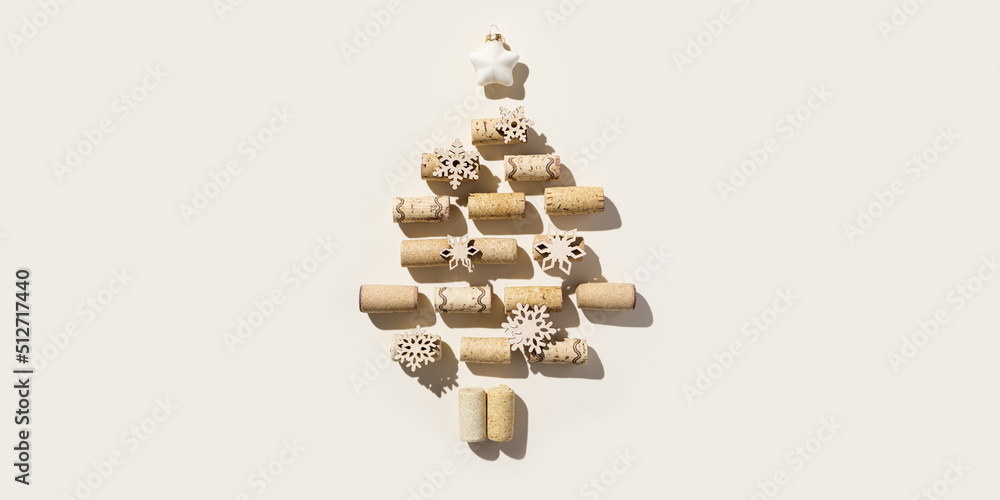 Wine corks as Christmas Tree on beige background, sun shadows. Wooden bottle stoppers as xmas, New Year decoration. Minimal Christmas flatlay, Happy New Year card, pastel neutral, design menu