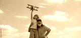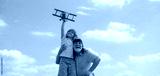 Grandson child and grandfather with toy plane over blue sky and clouds background. Two men generation grandfather and grandson playing outdoors. Generational family.