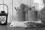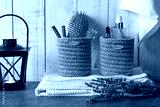 cozy interior in the bathroom with white towels, lavender and hand-knitted jute boxes for accessories and cosmetics, eco-friendly and natural materials, scandinavian style