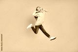 Full size photo of satisfied girl jump hands touch headphones scream have fun isolated on beige color background