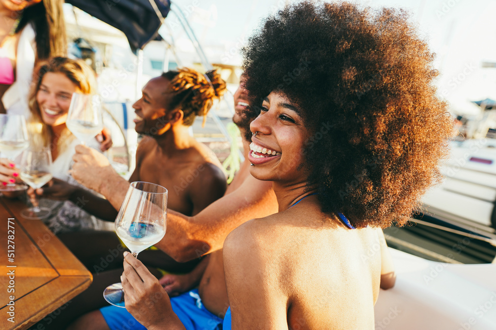 Happy multiracial friends having fun drinking wine at boat party outdoor - Focus on african girl face