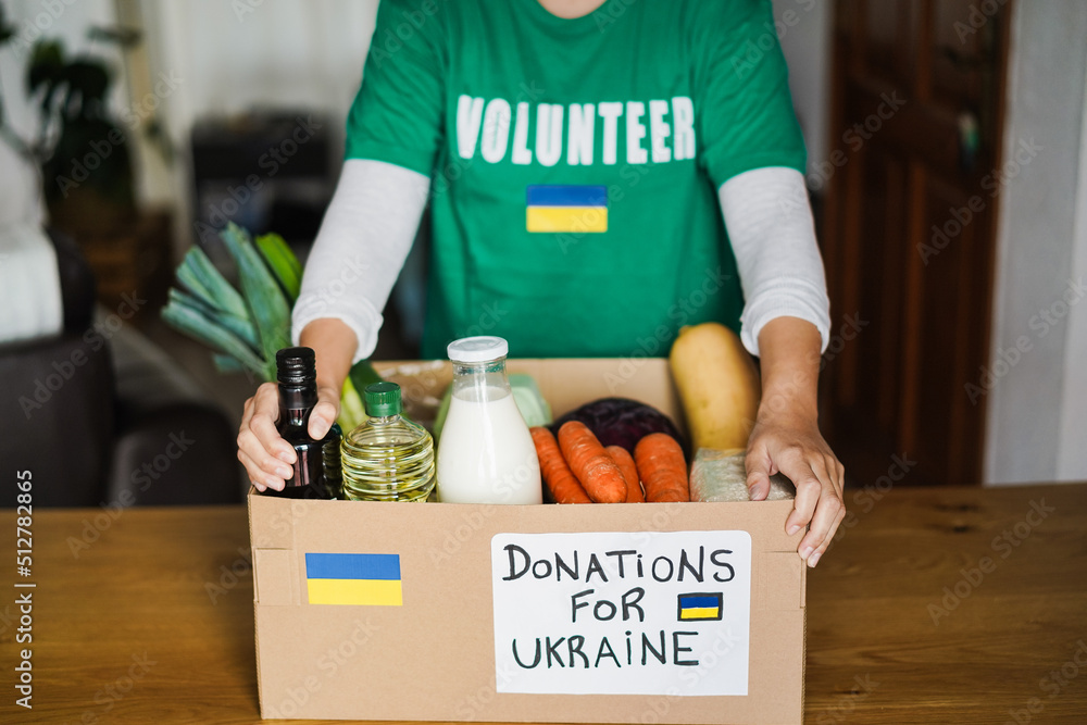 Volunteer preparing food box for Ukraine war refugees - Focus on hands holding box