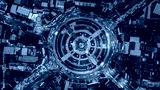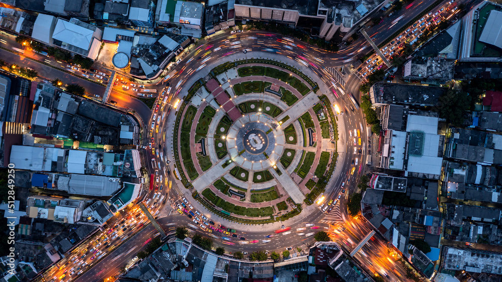 Aerial top view road roundabout interchange in city at night, Aerial view of highway and overpass in city at night.