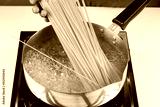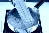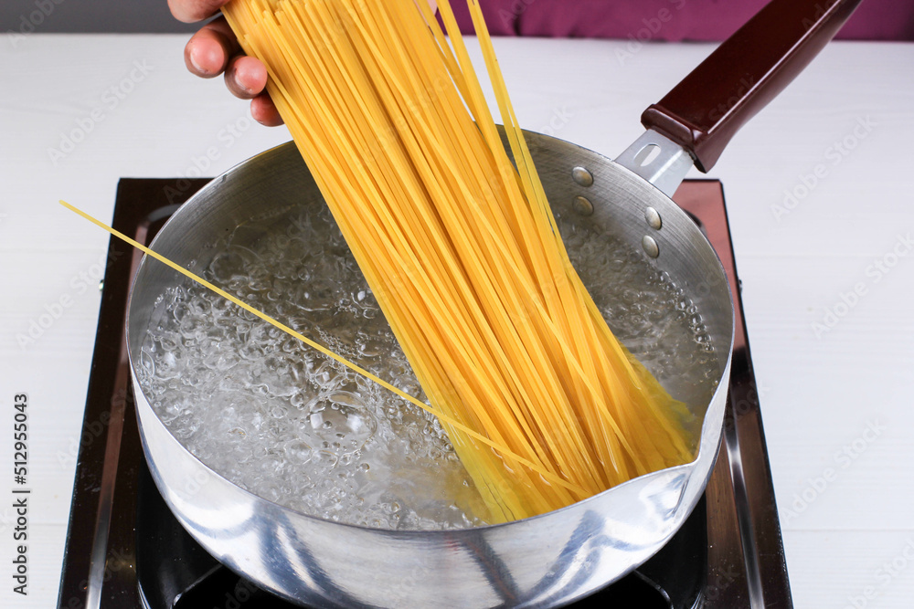 Women Cooking Spaghetti in Pan of Boiling Water in the Kitchen
