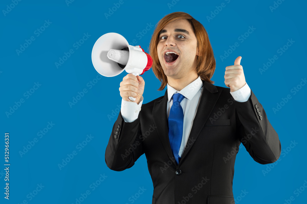 Young man using an electric megaphone. Guy with speaking-trumpet, bullhorn, blowhorn, or loudhailer. Red background. Advertising, demonstration, student protest concept