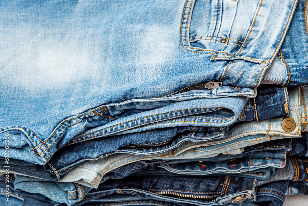 Various blue jeans pants or trousers made of blue-colored denim cloth. Closeup abstract texture cotton fabric for background design. Pair of jeans, pockets, rivets, buttons, seams