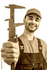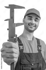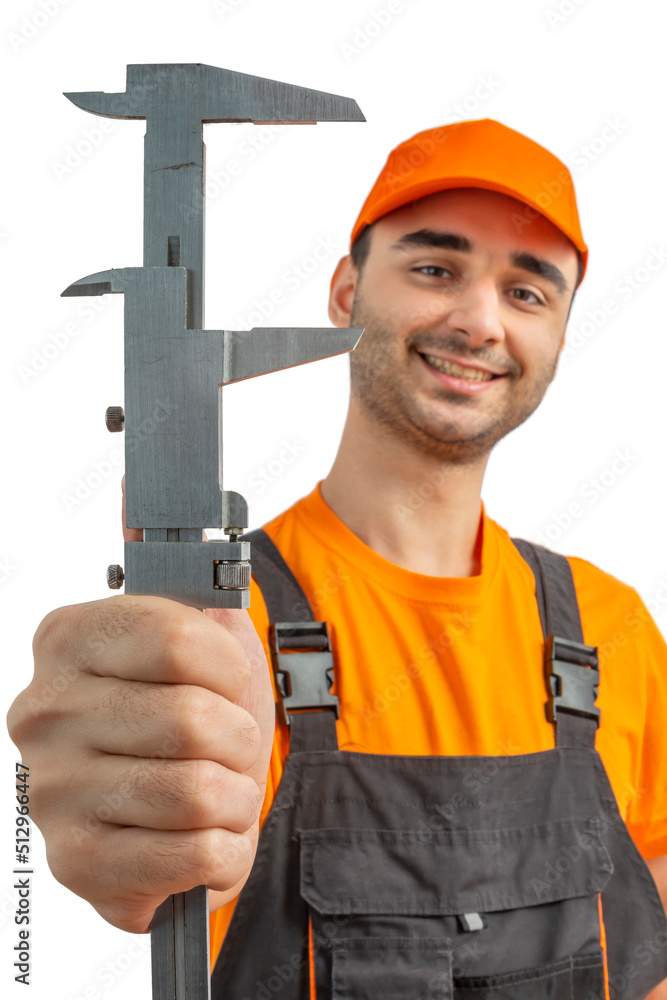 Young worker with caliper in his hands. Tool for measurement. Craftsman repairman wearing orange uniform cap and t-shirt, overalls on a white isolated background
