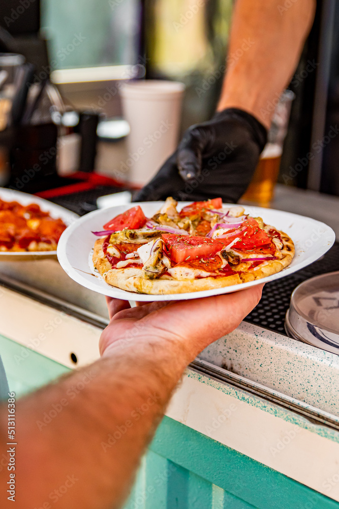 chef hands gives a mini pizza to man from food truck on street. street food, fast food.