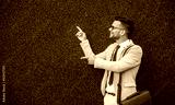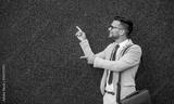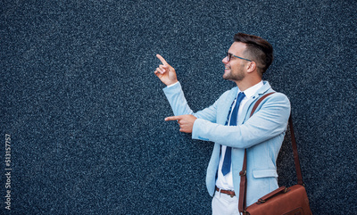 Young businessman is pointing fingers aside at copy space for your text advertisement. Business, education, lifestyle concept