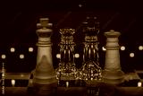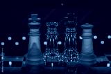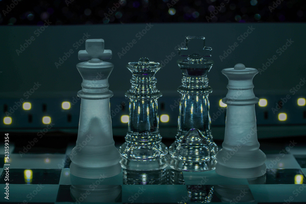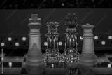 Chess with game pieces made of glass, queen, king, pawn and game board made of glass in black and white