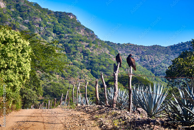 two american vulture in the road with mountains in the background and blue sky in a sunny day santa maria del oro nayarit