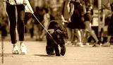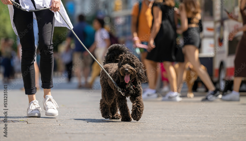 Cheery Black Aussiedoodle with Tongue Out Walks in the Sun in New York City on Pavement