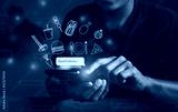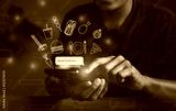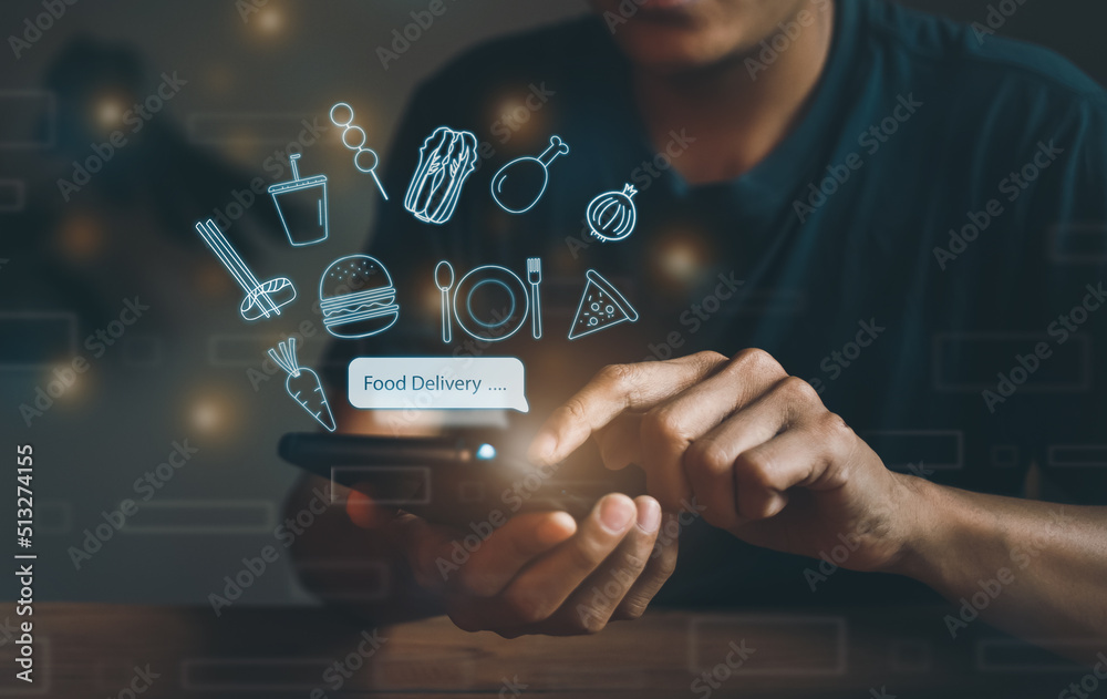 People use mobile phones to place online restaurant orders, delivery, technology, internet, food burger icons, pizza, coffee, chicken, sushi, vegetables, noodles, service meal food menu online at home