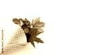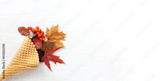 waffle cone with autumn leaves and berries on a light surface top view. seasonal bouquet