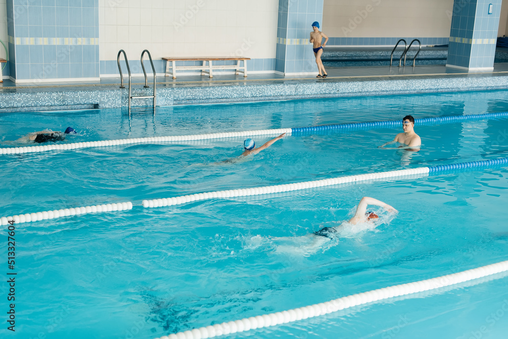 A group of boys and girls train and learn to swim in a modern swimming pool with an instructor. Development of children's sports. Healthy parenting and promotion of children's sports.