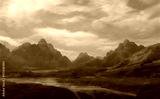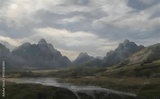 Modern art painting on the canvas of the beautiful landscape in green and gray colors