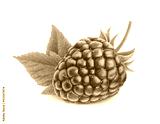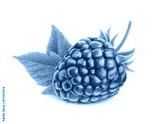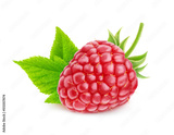 One rasberry fruit close up with leaf and stem isolated on white background