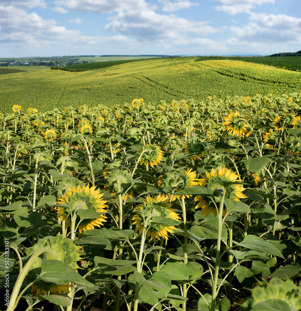 close up of inverted head of sunflower flowers by sun, sunflower field and mountains, agricultural hilly summer landscape